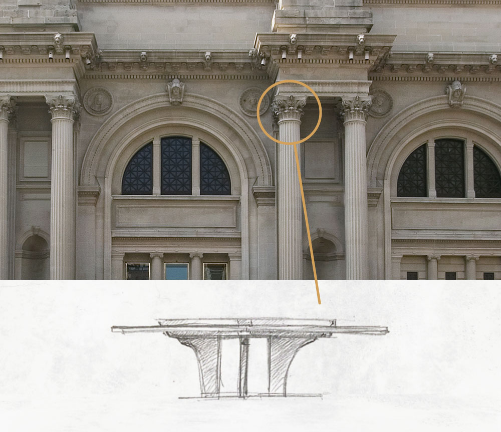In architecture, the term capital refers to a crowning member of a column or columnar form that provides structural support for the arch above. The design of the Corinthian Cocktail Table draws inspiration from the capitals of the columns on the facade of The Met.
